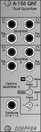Module A-156 is a Dual Control Voltage Quantizer. A quantizer converts a continous control voltage in the range 0...+10V into a stepped output voltage in the same voltage range (i.e. only certain voltages occur). Normally 1/12 V steps are used to obtain semitone steps. Quantizer 2 of the A-156 allows has more sophisticated quantizing modes like major scale (i.e. only voltages corresponding to the major scale), minor scale, major chord, minor chord, fundamental+fifth and addition of seventh or sixth when chords are selected. Only those voltages appear at the CV output which comply with the selection rule (e.g. minor chord with seventh). The mode setting of quantizer 2 is done with 3 switches (1-0-1 type with middle position). From the factory quantizer 1 is working in the semitone mode. But there is a jumper on the pc board that can be changed so that even quantizer 1 uses the same scale as quantizer 2.