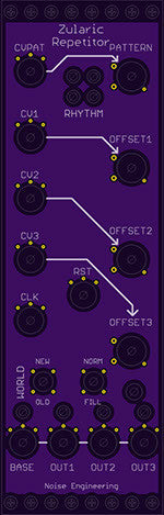 Zularic Repetitor is a rhythmic gate generator based off of the rhythmic theory of African music. A core pattern forms the basis and variation is achieved by offsetting this pattern in time relative to the base.