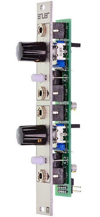 The Malekko 8NU8R is a clever utility. A dual 4hp attenuator, the 8NU8R also sports the ability to switch on diode rectification waveshaping. Regular attenuation, as well as full and half wave rectification with adjustable attenuation are possible. When no input is present, each half of the 8NU8R produces a steady DC voltage (offset) adjustable by the level control. DC offsets have many uses in a modular system.