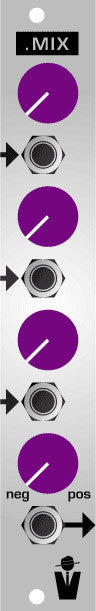 This is .mix. It's a 4 hp mixer with a transistor makeup gain stage copied from the moog cp3, including the rail voltages (a regulator is used to provide the -6v rail).