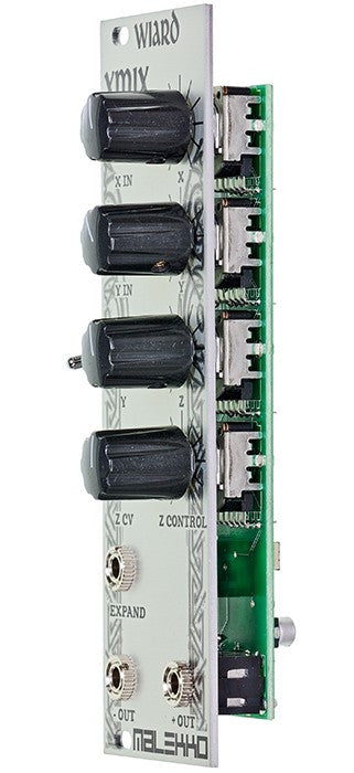 The XMIX is a versatile mixing/crossfading utility module with Wiard flair. There are level controls for the two inputs (X and Y). The Y input can be inverted via a switch. Z controls the balance of X Vs. Y. Z has a CV input, along with an attenuator for CV amount. Positive and negative outputs are provided, as well as an Expand input which provides a unity input to chain the output of other modules (such as another XMIX).