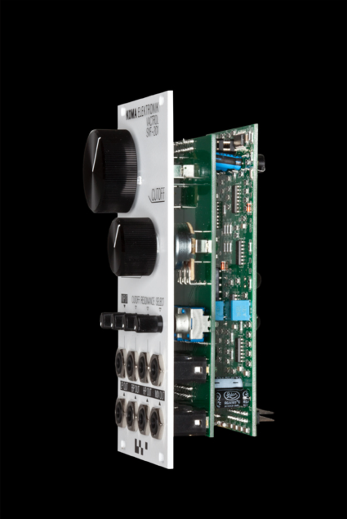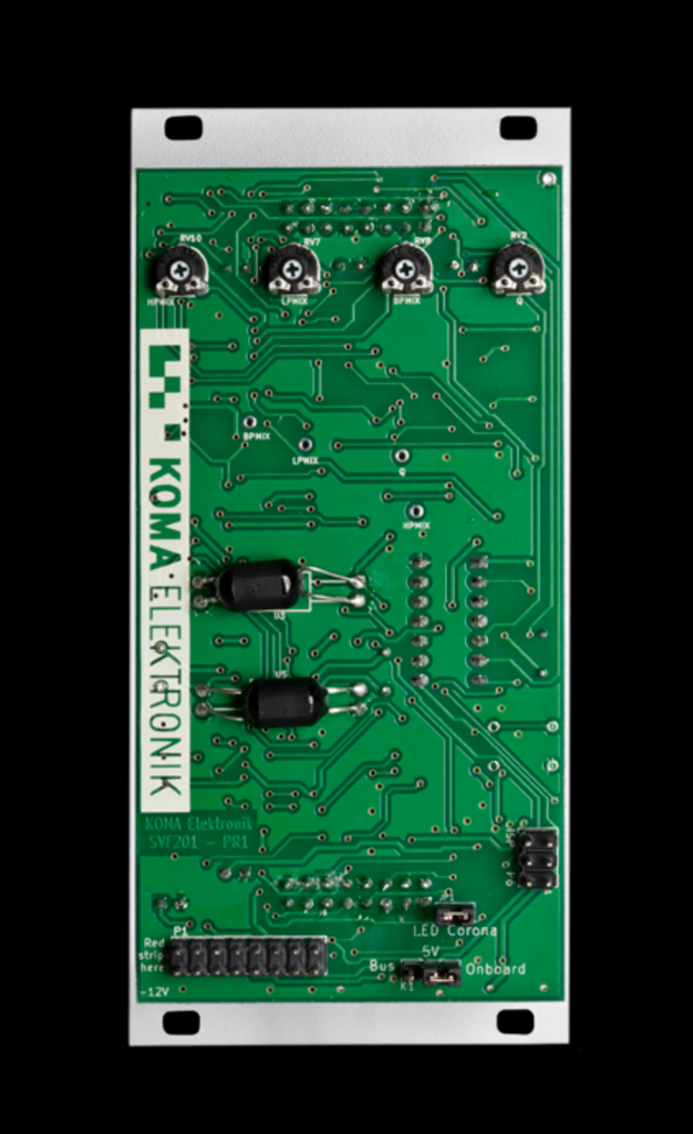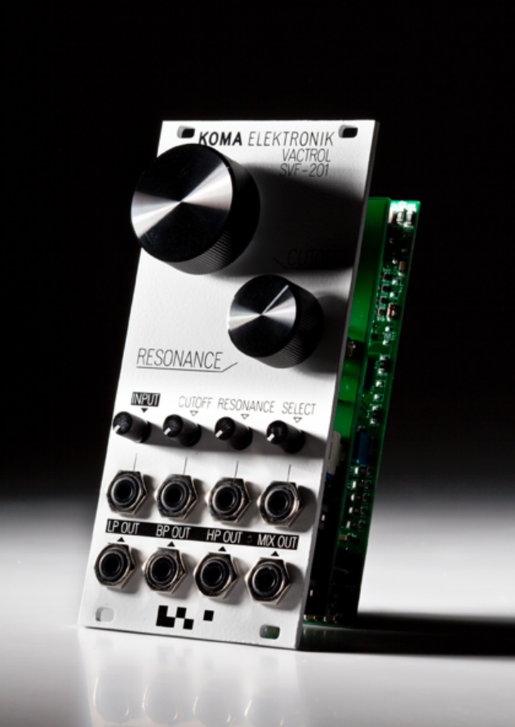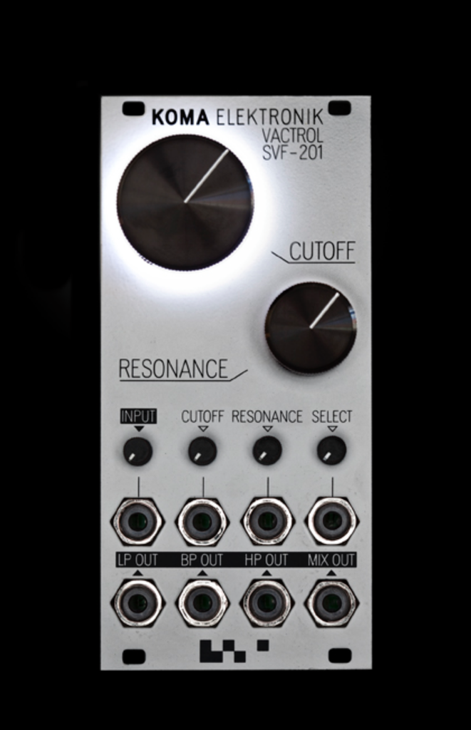 The KOMA Elektronik SVF-201 is a state variable filter for the Eurorack modular synthesizer system. Its filter circuit is built up with optical parts (vactrols) therefor delivering excellent studio audio quality and an unique warm analogue sound. The module uses parallel mounted PCBs so it can be used in skiffs as well as in big cases, the total depth is less than 4 cm. The SVF-201 comprises 4 audio outputs that can be used independent of each other at the same time, a High Pass, Band Pass, Low Pass and the unique first ever CV’able Mix Out. The Mix Out out let’s you sweep continuously through the other three outputs by means of a knob and control voltage.