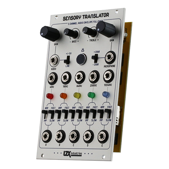 Dissect sonic energy into a rainbow of visual modulation sources!Sensory Translator is an audio-to-video interface module designed to generate a variety of visually rich animation control signals. The audio input and internal microphone are mixed together and processed by Bass and Treble tone controls before being fed into a bank of five 4-pole Band Pass Filters. These bandpass filter outputs are then processed by individual envelope followers. Each envelope follower has 3 decay speeds, as well as an Impulse mode for beat-to-trigger extraction. All signal paths and control ranges are compatible with standard EuroRack audio module signal ranges, so this module is equally at home in an audio synthesis system.