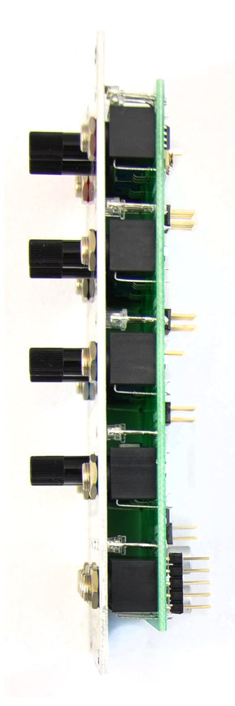 Each channel also has a jumper to make the Scale knob unipolar (no inverting, attenuate only). This is useful for mixing audio instead of CV. A breakout header allows for padding of the signal (useful for fine-tuning a precise voltage such as 1V/oct).