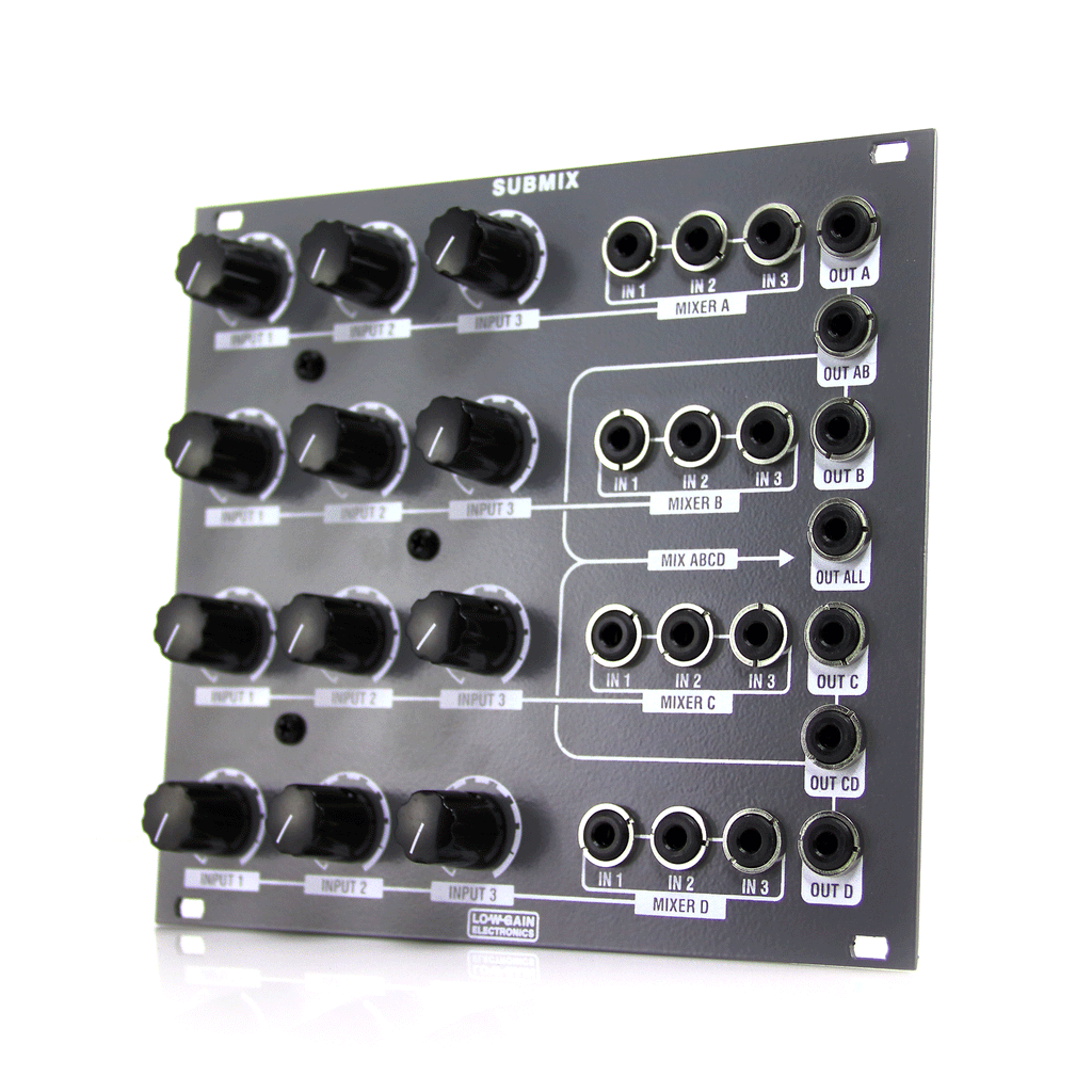 The SubMix was re-designed with the intention of sub-mixing the waveform outputs from VCO's. I've found by using passive mixers I'd hear drop outs or "nulling" of signal which sounds similar to phase cancellation. So passive mixers functioned more like waveform "on/off" switches for me. This effect was due to the different loads being created on passive input nodes (typically caused by the attenuator varying the load). With active inputs (unity gain buffers) the load on the summing bus stays constant and you get smoother/more gradual mix regardless of the load on the input.