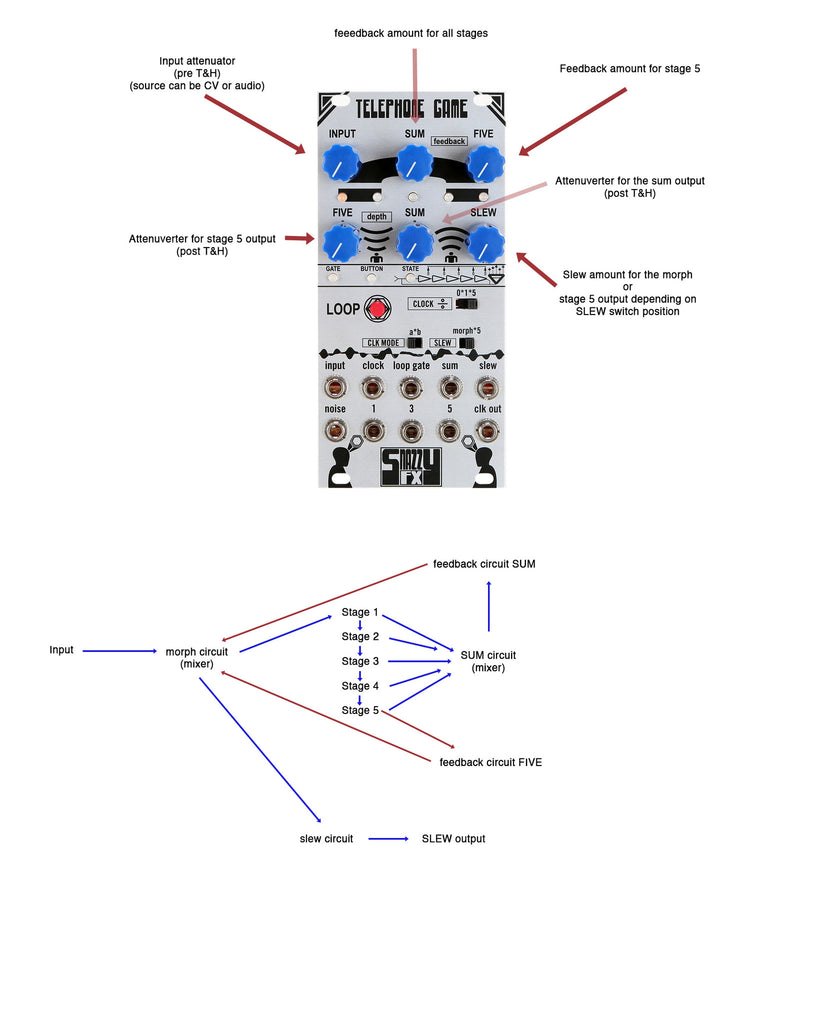 To put it lightly, The Telephone Game can crate a multitude of different modulation effects And it is EXTREMELY SIMPLE TO USE. *just give it a clock!….you can either use the built in white noise as your Signal Source, or plug in any CV or Audio in your system. Then you have the option of taking the CLOCK OUT from the Telephone Game and driving your sequencers, clock dividers, and envelope generators/vcas IN TIME with all the wonderful random voltages the Telephone Game creates. (highly recommended) OR use it without any other clocked modules and tune in to the wavy world of "science sounds".
