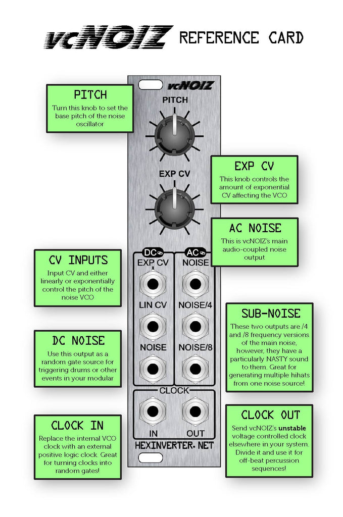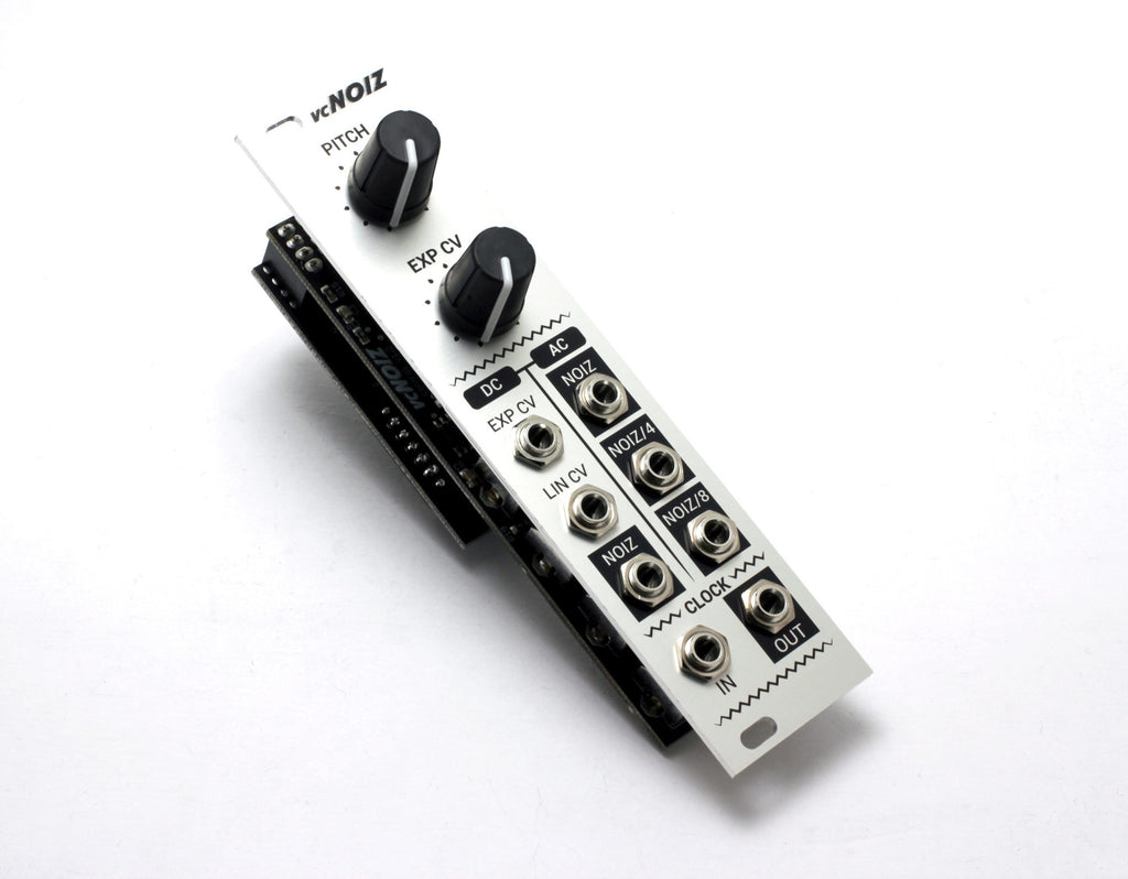 vcNOIZ is a unique sounding voltage controlled digital noise source. The frequency of the noise is both linearly and exponentially controllable by analogue control voltage signals. It creates positively raunchy C64-esque digital noise and sounds great for hihats and other sounds as well!