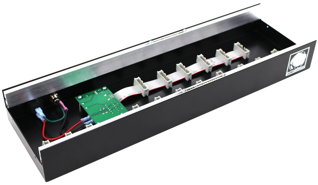 The included Pittsburgh Modular power supply provides +12v @ 850mA and -12v @ 850mA of power. A custom flexible power rail delivers power for up to 17 modules using standard 16 pin power headers. The power board uses an external 12VAC 2.0A AC power adapter.