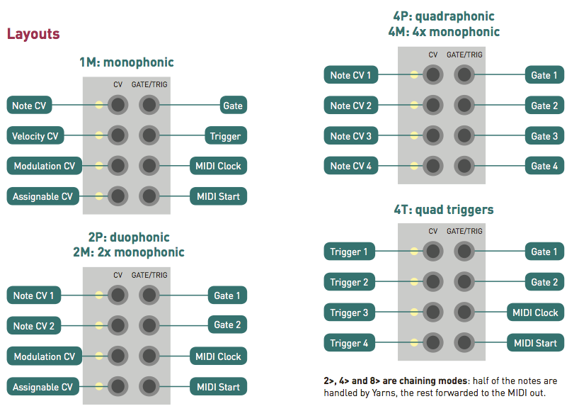 Yarns provides 4 CV outputs and 4 Gate/trigger outputs, which can be assigned to up to 4 voices. In single voice mode, note, velocity, modulation and aftertouch (or other CC) CV are produced, along with a gate, a trigger, and a clock/reset output. In two voices mode, two channel of note, modulation or aftertouch CV are produced, along with two gates, and clock/reset outputs. Finally, in four voices mode, four pairs of CV/Gate outputs are provided.