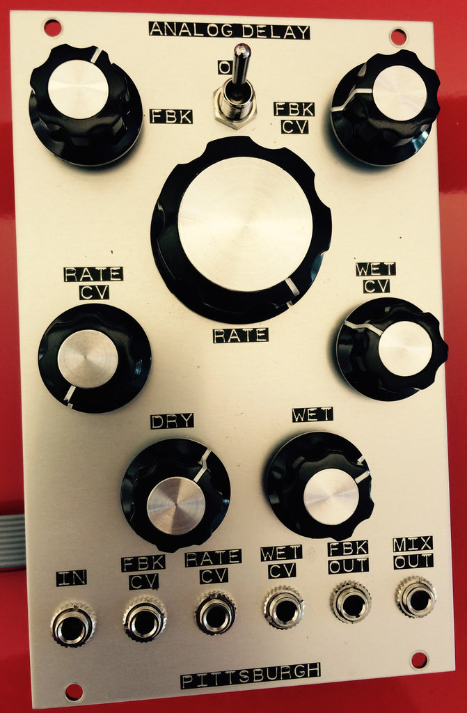 A brand new analog delay module designed around a pair of 4096 Bucket Brigade Delay Line (BBD) ICs to produce a distinct analog delay effect. The maximum delay time when shipped is set at a full second but this can be adjusted up to 2 seconds if you don't mind the grime and noise that comes with bending time to the limits. The Analog Delay offers voltage control of the delay time, feedback, and wet signal. A true bypass switch allows the delay to be enabled and disabled quickly.