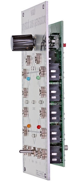 More than just a pretty face, the Malekko Wiard J.A.G. (Joystick Axis Generator) is a unique and often surprising device that can twist almost any patch into a new creation. It takes any two modulation sources (LFO, Envelope, Sequencer, Random Generator, Oscillator, X and Y of a Joystick, etc…) and maps out an X and Y location. From this XY coordinate, the output level of the 8 outputs in the circle are determined, as well as a center (Dome with level control) and Edge (opposite of Dome) level – multiplying your 2 modulation inputs and providing you with a total of 12 outputs. The voltage distribution is most easily visualized with a joystick input; moving the the joystick will cause the LEDs to indicate the location of the joystick (as well as the level of each output), and the Dome LED will glow brighter the closer the joystick is to the center.
