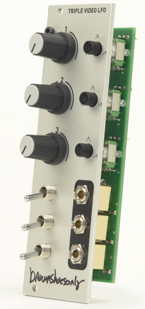 The brownshoesonly triple video lfo is your modulation answer in LZX. It contains 3 discrete LFOs with dual range switch and a skew control going from ramp wave to triangle to sawtooth. The two ranges are designated as a lower slow fade/strobe and a much wider fade/audio range. Perfect for controlling your TVFKG and FM on VWG.