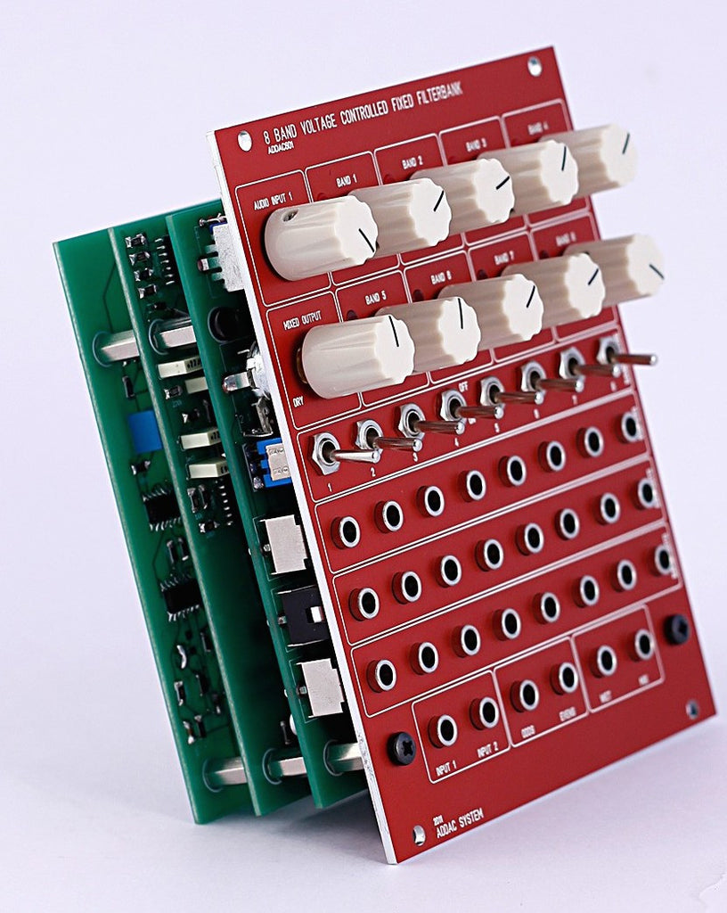 With its 8 fixed frequencies, this very special filterbank has two additional features that you won't find anywhere else. Each of the 8 band volumes can be controlled through a linear high performance VCA, which adds great dynamics and new abilities to the art of filtering. Additionally this module also doubles as an envelope follower, with a dedicated CV output per band.
