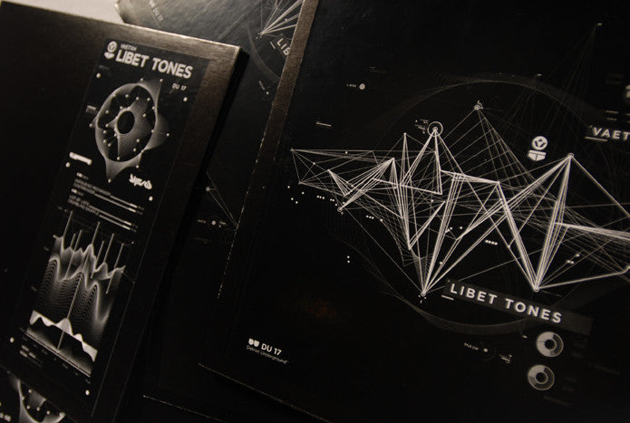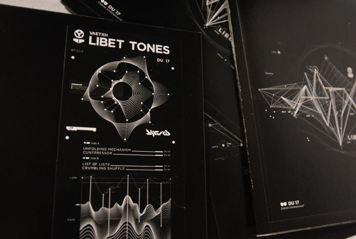 Vaetxh’s inaugural release Libet Tones for Detroit Underground draws on both musical themes—Electronic IDM and musique concrète—and non-musical themes from mathematics, resulting in four labyrinthine tracks that are studies in free association, a state in which ideas float from the unconscious to the conscious. Record sleeve design by Dmas3™.