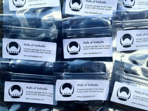 The Halls of Valhalla is a reverb cartridge for the Tiptop Audio Z-DSP. The cartridge contains 8 original reverb algorithms, custom designed for the Z-DSP and the Eurorack environment. Voltage control over reverb decay, tone, and modulation allows the user to create reverbs ranging from small rooms to large halls to near-infinite decays. The Halls of Valhalla brings the artifacts of fixed point digital signal processing to the forefront, resulting in a thickness and warmth that evokes the classic digital gear of the 1970s through the early 1990s. The goal of the algorithms is not to evoke physical environments, but rather to create unreal spaces that range from subtle to bombastic, from light to dark, with a lushness that turns simple input sounds into rich orchestral washes. The Halls of Valhalla brings the Valhalla DSP aesthetics into the hardware world: Minimalist interface, Maximalist sound.